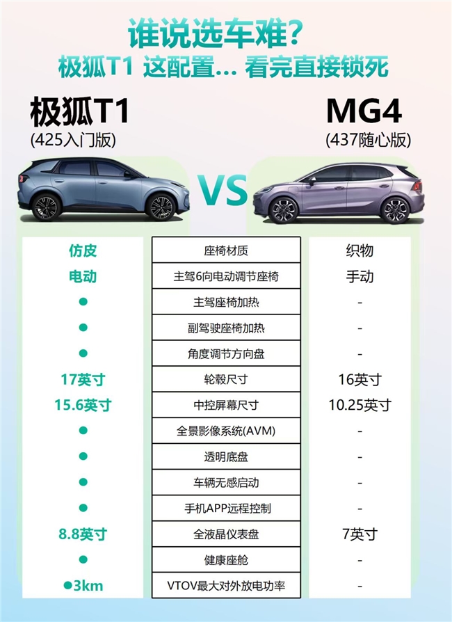 买纯电车,电池安全永远是绕不开的重点,极狐 T1 在这方面的表现堪称 “教科书级”。它搭载的极光电池,不仅提前一年通过了新国标 17 项系统测试和 6 项关键测试,极狐更是新国标过温保护、过流保护等核心测试项目的主要制定者,对安全的理解远超普通车企。比如电池包挤压测试,极光电池的标准是新国标的 3 倍;密封性测试更是达到新国标的 96 倍;甚至极端的外部火烧测试,它也能达到新国标 2 倍多的标准。更硬核的是,极光电池还实现了行业首个 “同一块电池连续过三项极端试验”——350mm 水下刮底、500m 颠簸路段、超国标 3 倍挤压,全程没起火没爆炸,极狐还敢承诺 “买极狐 T1,烧一赔一”。要知道它的 PPB 级安全标准,十亿分之一的缺陷率,比行业常见的 PPM 级(百万分之一)严格 1000 倍,这份安全感真的难得。MG4 的电池是主流梯队配置,日常使用可靠,但极狐 T1 在极端安全测试和承诺上,明显投入了更多心思,开车出门更踏实。